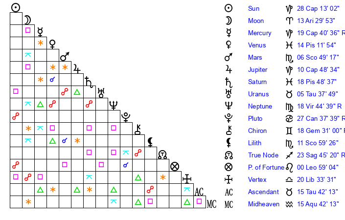 | Mercury | 19 Capricorn 39 | 15 Capricorn 11 | 15 Taurus 39 |