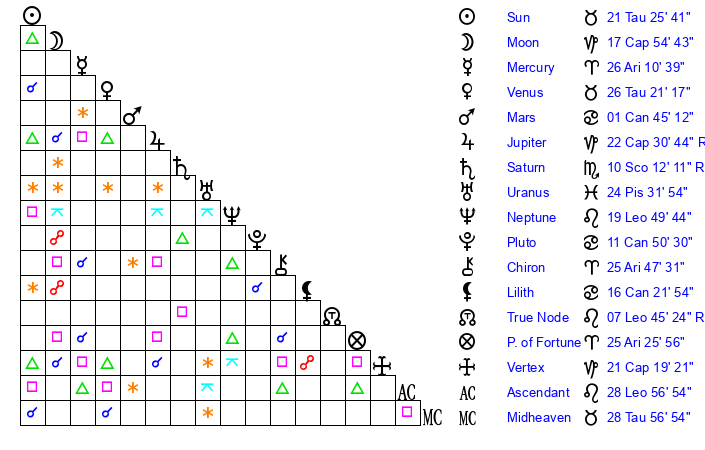 | Saturn | 10 Scorpio 48 | 28 Pisces 52 | 9 Scorpio 25 |