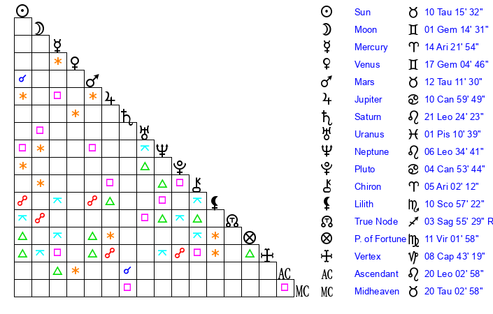 | Neptune | 6 Leo 34 | 1 Aries 7 | 9 Leo 32 |