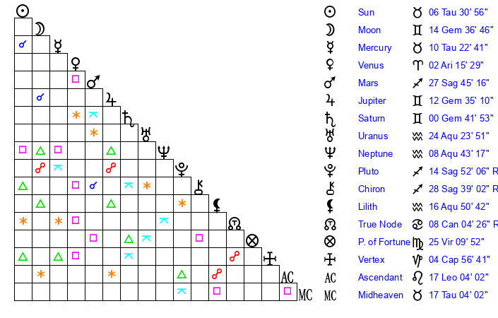 | Saturn | 0 Gemini 34 | 27 Pisces 19 | 3 Gemini 36 |
