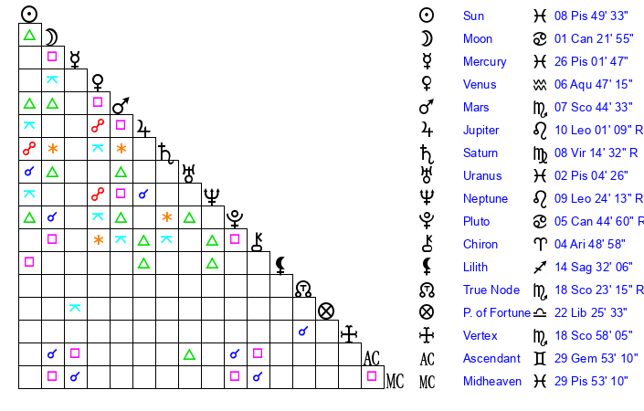 | Sun | 8 Pisces 49 | 10 Pisces 21 | 21 Gemini 23 |