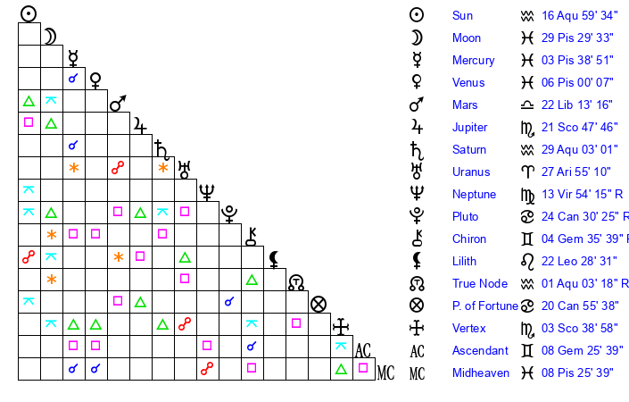 | Saturn | 29 Aquarius 11 | 17 Pisces 59 | 8 Pisces 44 |