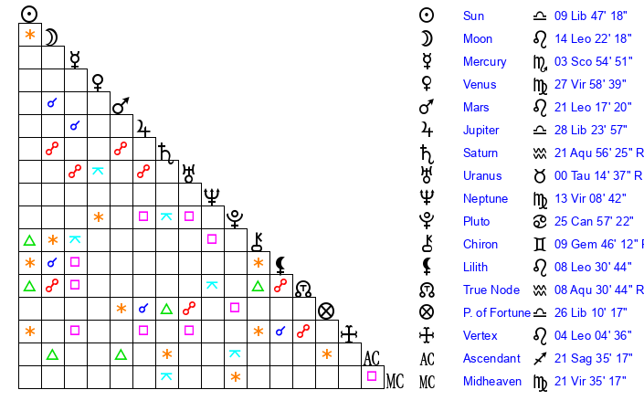 | Neptune | 13 Virgo 8 | 0 Aries 28 | 14 Virgo 30 |