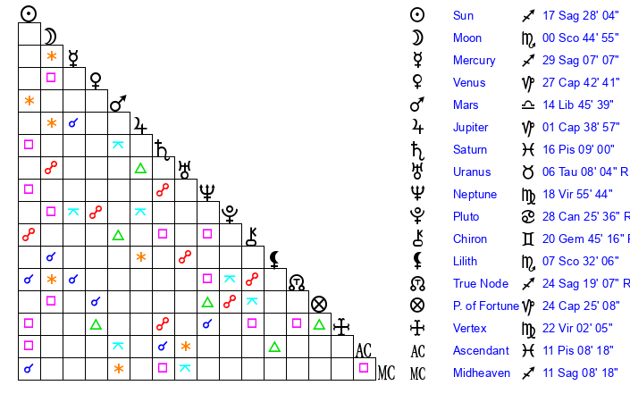 | Sun | 17 Sagittarius 28 | 17 Sagittarius 52 | 17 Pisces 43 |