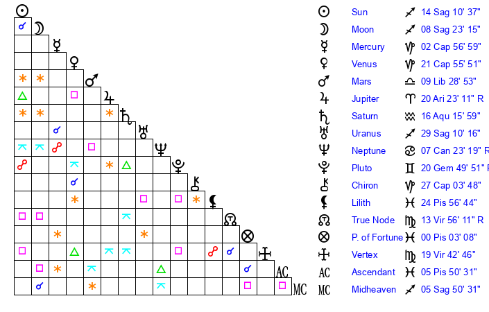 | Venus | 21 Capricorn 56 | 7 Sagittarius 23 | 14 Taurus 42 |