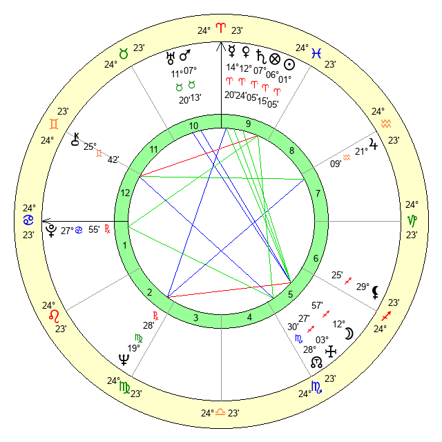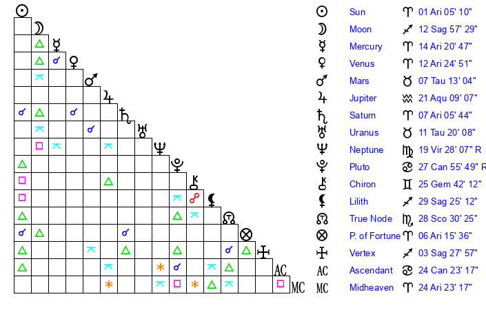 | Sun | 1 Aries 5 | 1 Aries 59 | 25 Gemini 30 |