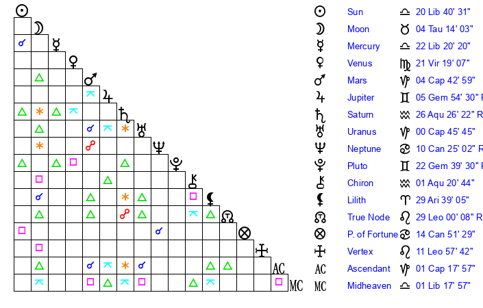 | Moon | 4 Taurus 16 | 3 Leo 23 | 22 Virgo 47 |