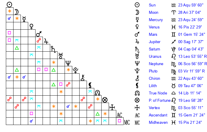 | Sun | 24 Aquarius 0 | 24 Aquarius 59 | 29 Aries 37 |