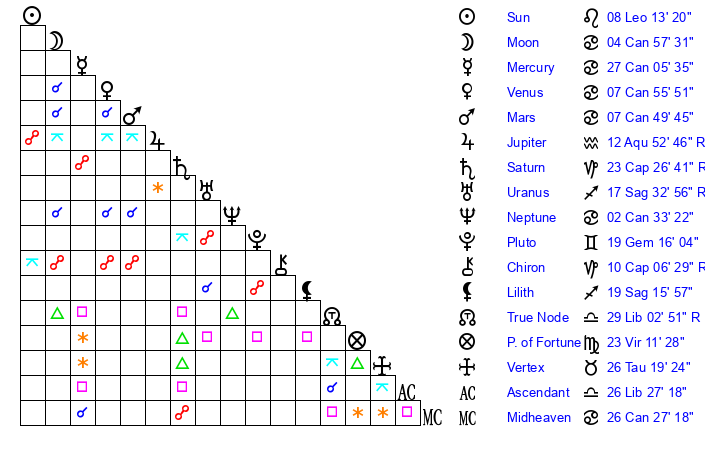| Sun | 8 Leo 13 | 9 Leo 26 | 9 Sagittarius 20 |