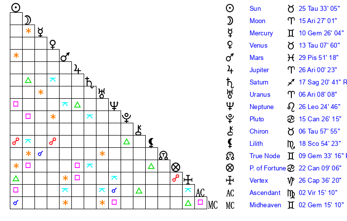 | Moon | 15 Aries 27 | 10 Capricorn 50 | 10 Scorpio 40 |