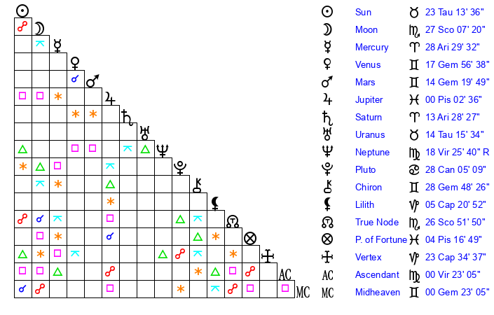 | Sun | 23 Taurus 13 | 24 Taurus 9 | 16 Leo 25 |