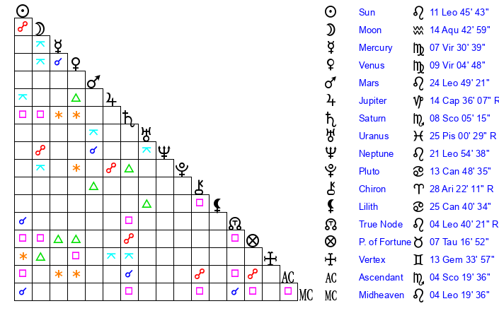| Neptune | 21 Leo 54 | 1 Aries 55 | 24 Leo 44 |