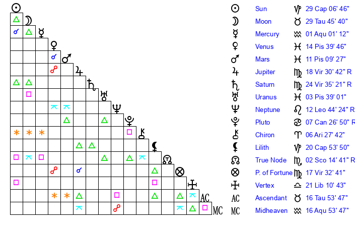 | Moon | 29 Taurus 57 | 6 Libra 37 | 21 Pisces 55 |