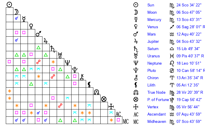 | Sun | 24 Scorpio 34 | 25 Scorpio 36 | 9 Pisces 5 |