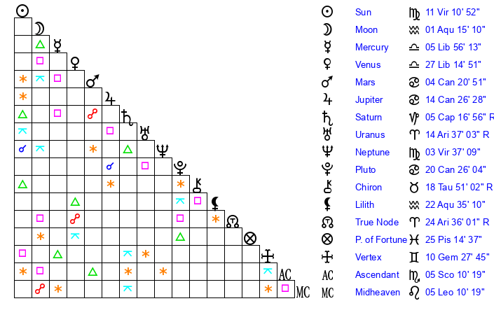 | Neptune | 3 Virgo 24 | 27 Pisces 18 | 1 Virgo 8 |