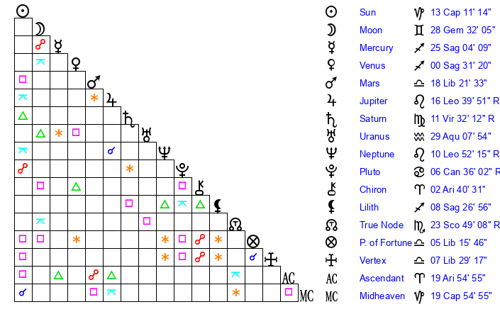 | Moon | 28 Gemini 43 | 16 Pisces 32 | 27 Aries 29 |