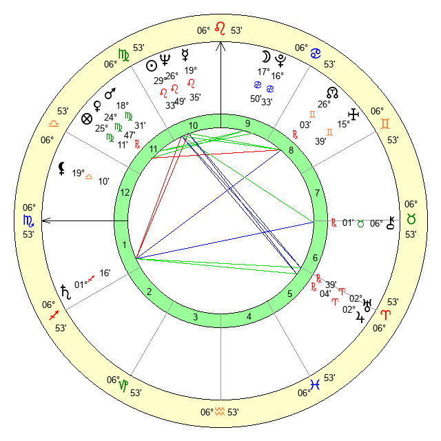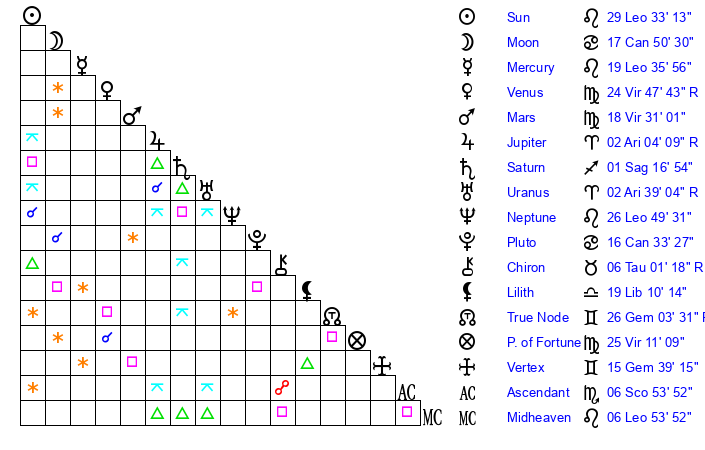 | Sun | 29 Leo 33 | 0 Virgo 49 | 6 Sagittarius 29 |