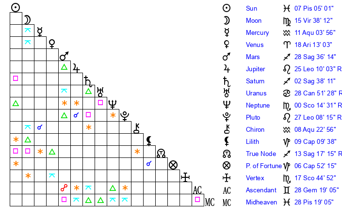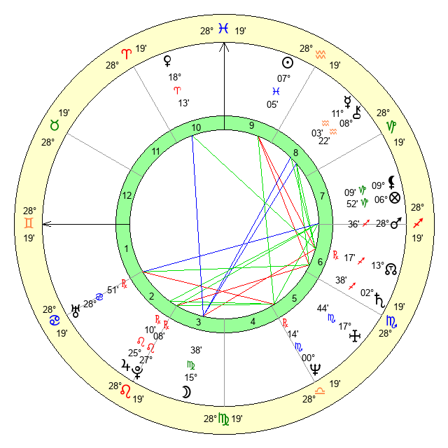 | Neptune | 0 Scorpio 14 | 28 Pisces 48 | 28 Libra 36 |