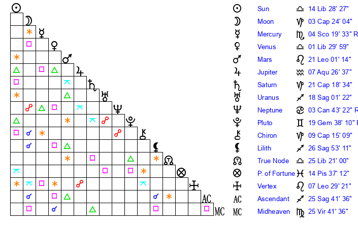 | Sun | 14 Libra 28 | 15 Libra 40 | 18 Aquarius 46 |