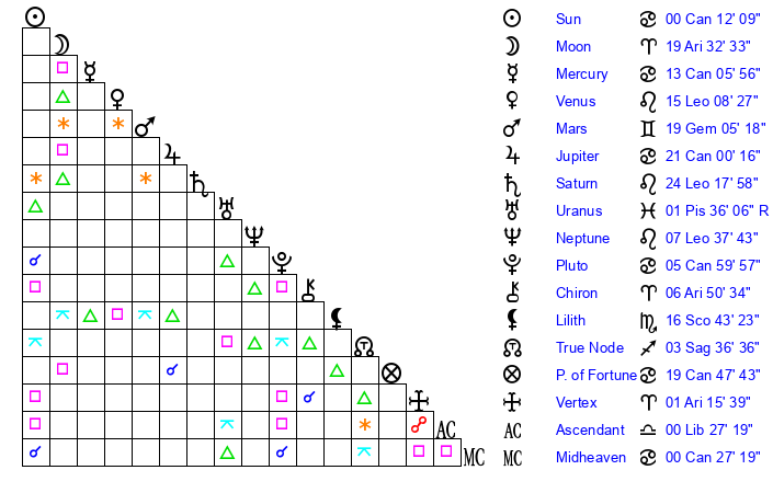 | Sun | 0 Cancer 12 | 1 Cancer 31 | 12 Libra 23 |