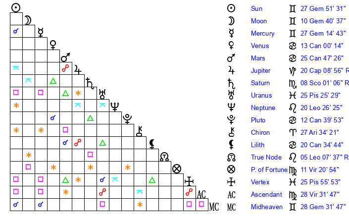 | Mercury | 27 Gemini 16 | 19 Cancer 38 | 26 Virgo 17 |