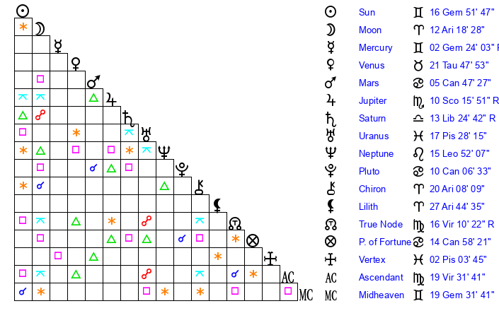 | Sun | 16 Gemini 52 | 18 Gemini 9 | 24 Virgo 45 |