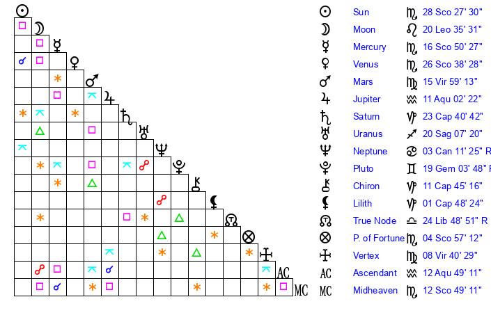 | Mercury | 16 Scorpio 51 | 26 Scorpio 32 | 15 Pisces 20 |
