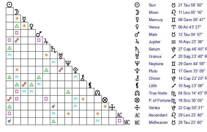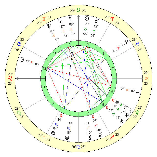 | Moon | 11 Leo 13 | 4 Sagittarius 13 | 1 Aquarius 41 |