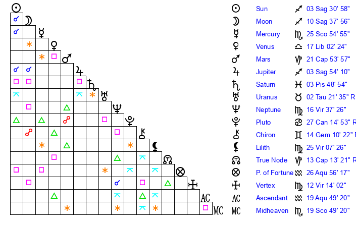 | Moon | 10 Sagittarius 41 | 15 Aquarius 58 | 2 Aries 3 |