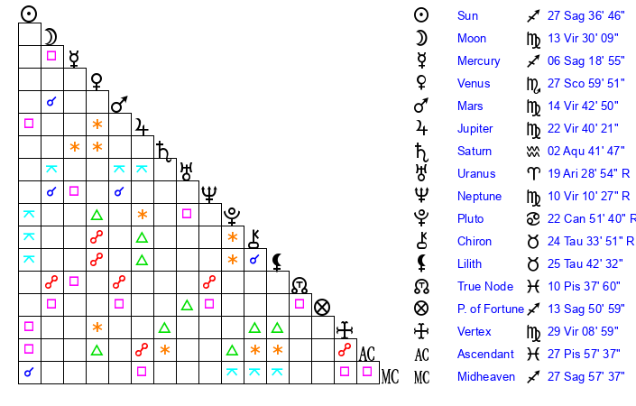 | Moon | 13 Virgo 29 | 24 Sagittarius 4 | 20 Aquarius 24 |