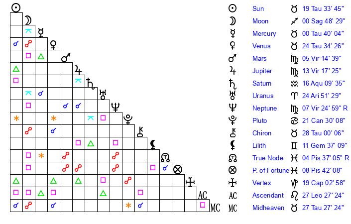 | Sun | 19 Taurus 34 | 20 Taurus 17 | 17 Leo 35 |