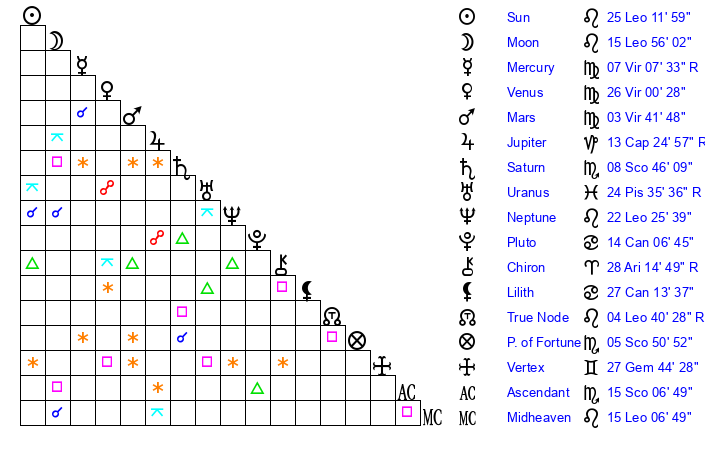| Sun | 25 Leo 12 | 26 Leo 0 | 3 Sagittarius 56 |