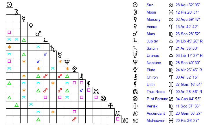 | Saturn | 21 Aries 49 | 19 Pisces 15 | 28 Aries 15 |