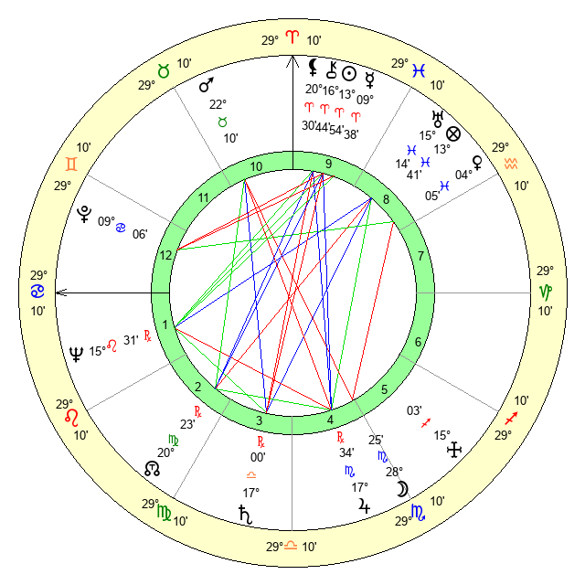 | Sun | 13 Aries 54 | 15 Aries 10 | 22 Cancer 10 |