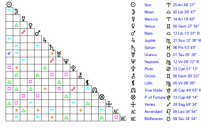 | Sun | 25 Aries 46 | 26 Aries 57 | 22 Cancer 15 |