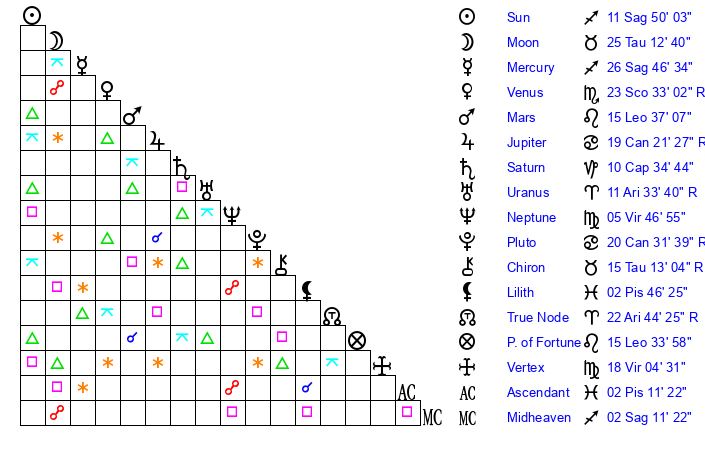 | Sun | 11 Sagittarius 50 | 12 Sagittarius 48 | 18 Pisces 10 |
