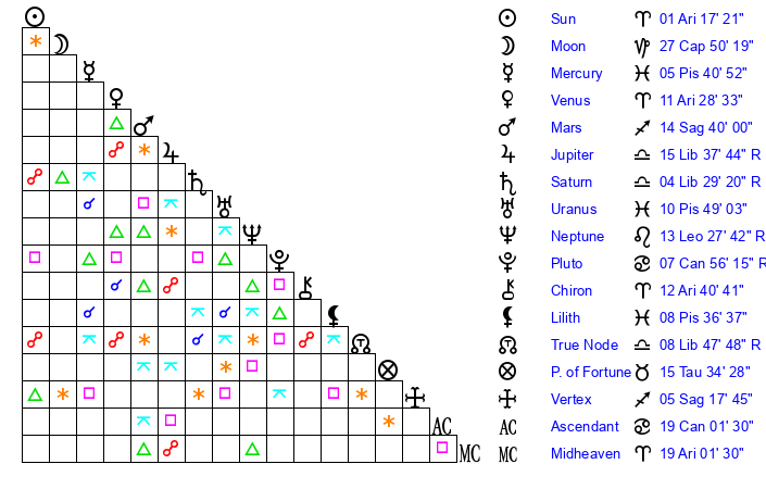 | Sun | 1 Aries 17 | 2 Aries 19 | 10 Cancer 57 |