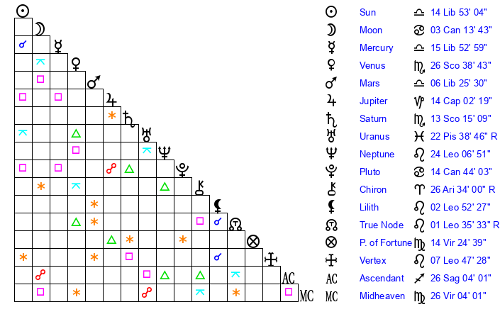 | Sun | 14 Libra 54 | 15 Libra 40 | 25 Capricorn 50 |