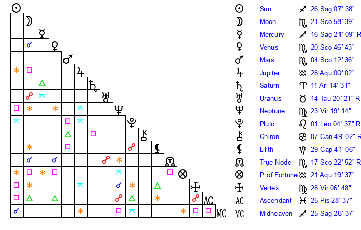 | Sun | 26 Sagittarius 8 | 27 Sagittarius 1 | 24 Pisces 13 |