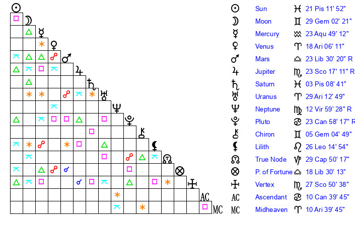 | Sun | 21 Pisces 11 | 22 Pisces 22 | 18 Gemini 52 |