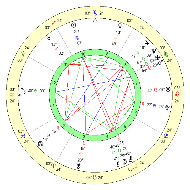 | Neptune | 9 Virgo 57 | 29 Pisces 33 | 9 Virgo 10 |