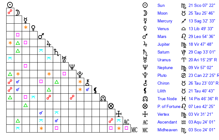 | Moon | 25 Taurus 27 | 9 Virgo 1 | 17 Libra 50 |