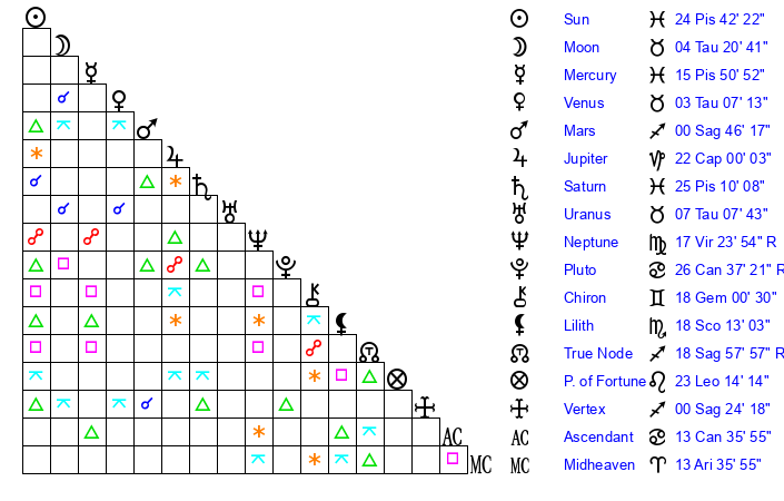 | Sun | 24 Pisces 42 | 25 Pisces 22 | 20 Gemini 19 |