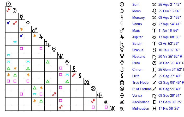 | Sun | 25 Aquarius 21 | 26 Aquarius 15 | 21 Taurus 17 |