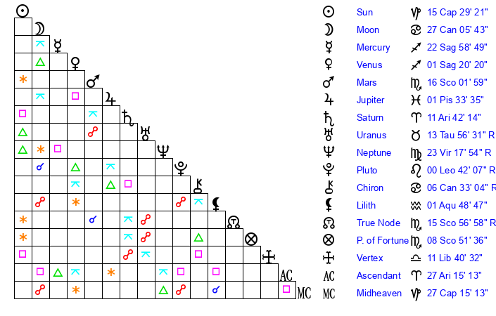 | Moon | 26 Cancer 59 | 12 Aries 52 | 22 Virgo 20 |