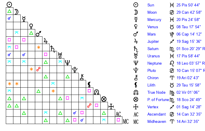 | Mars | 6 Capricorn 14 | 19 Cancer 24 | 0 Pisces 19 |
