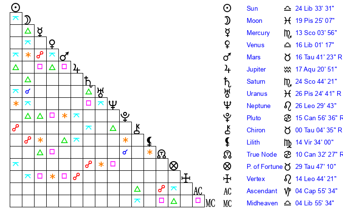| Sun | 24 Libra 34 | 25 Libra 34 | 4 Aquarius 45 |