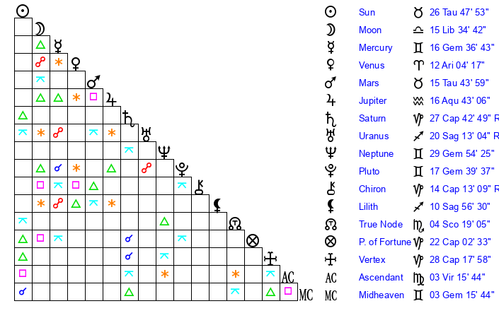 | Sun | 26 Taurus 47 | 28 Taurus 0 | 24 Virgo 49 |