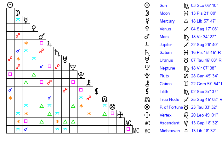 | Neptune | 18 Virgo 7 | 29 Pisces 53 | 18 Virgo 39 |
