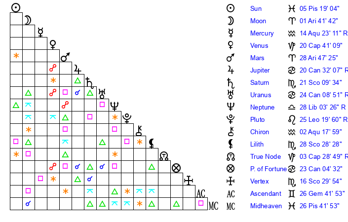 | Sun | 5 Pisces 19 | 6 Pisces 20 | 14 Taurus 25 |